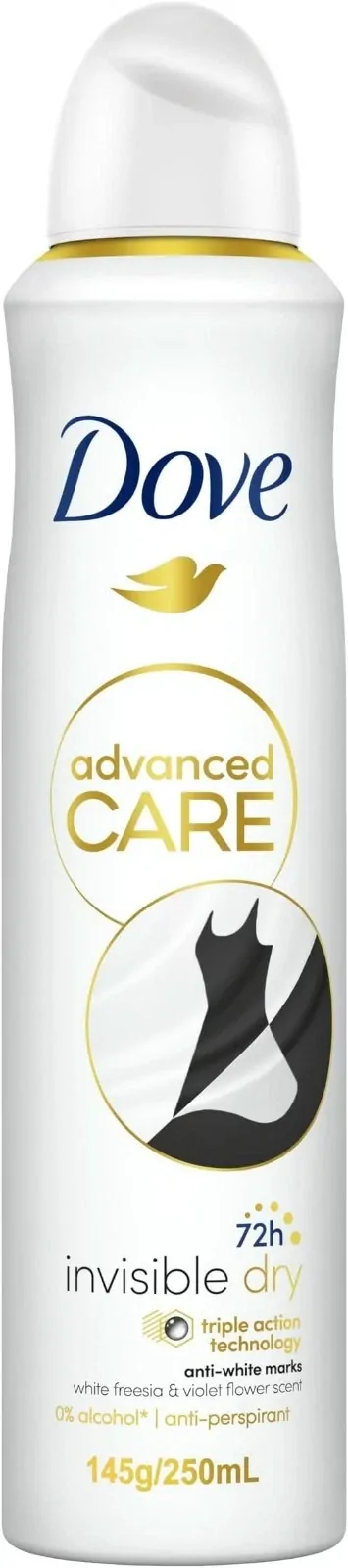 -Dove Advanced Care Invisible Dry Antiperspirant Deodorant Aerosol provides 72 hours of effective sweat and odour protection.
